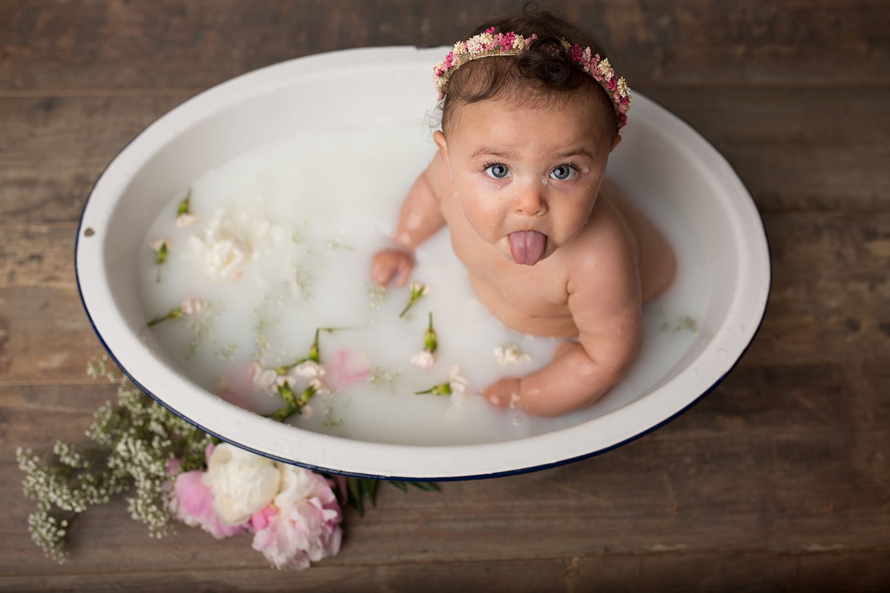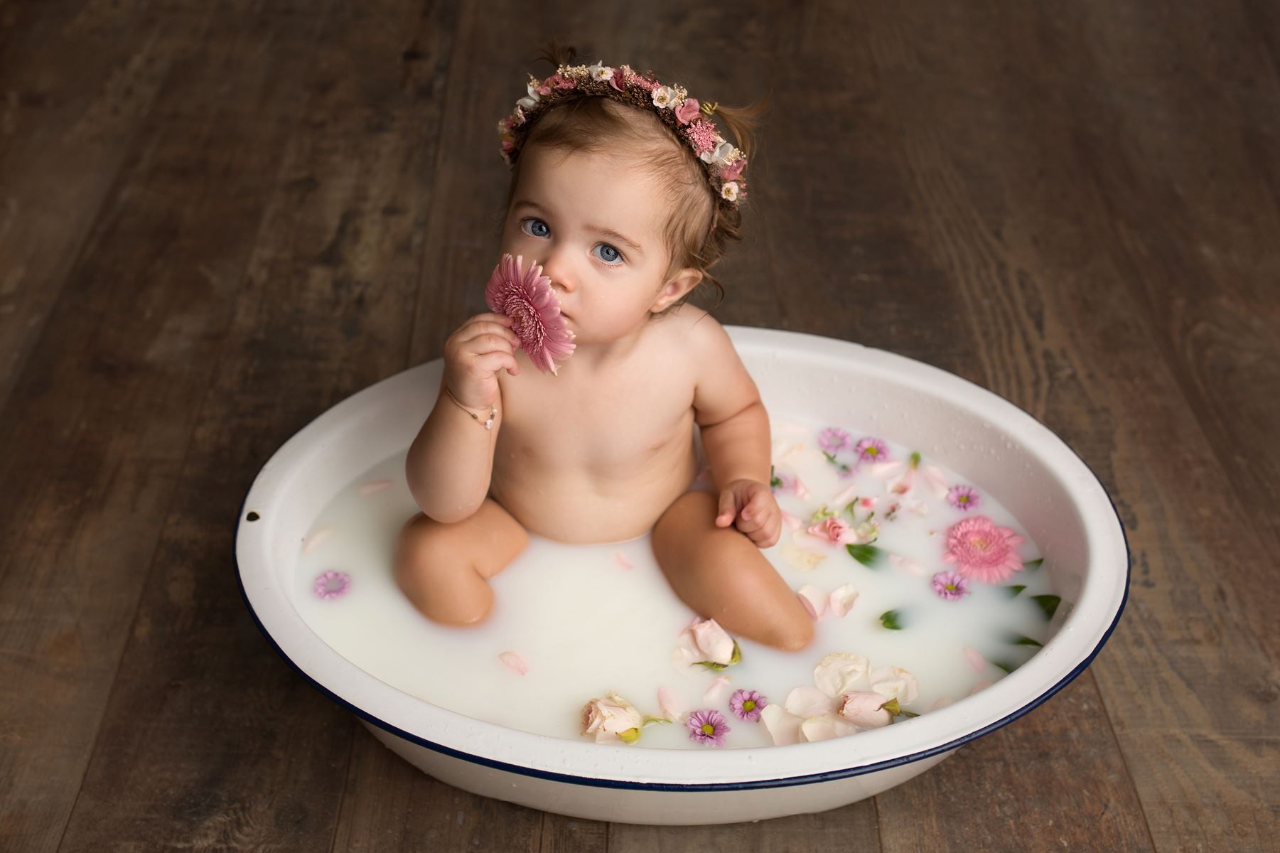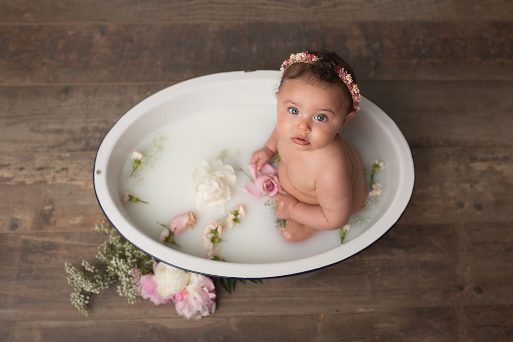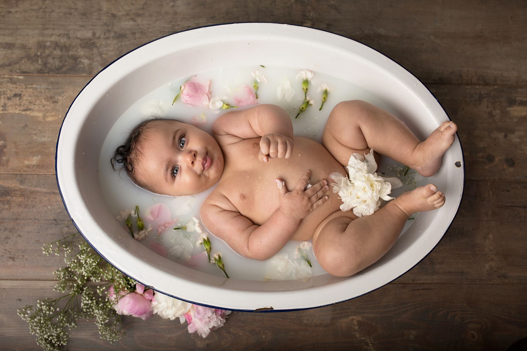 Lors de la séance photo, nous pouvons selon votre demande, faire des photos de votre bébé dans un bain de lait. Ces photographies sont naturelles, douces et intemporelles. C'est une excellente occasion de dévoiler les petites mains grassouillettes et les petits plis de votre bébé.